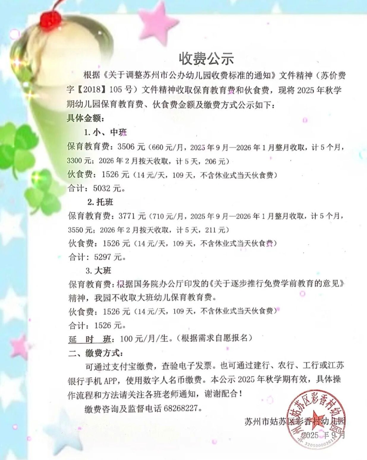 2025年秋幼儿园保育教育费、伙食费,收费公示
